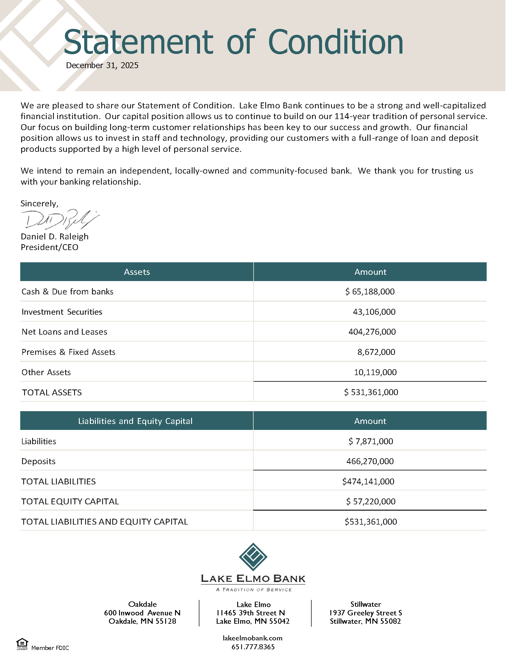 Statement of Condition | Lake Elmo Bank